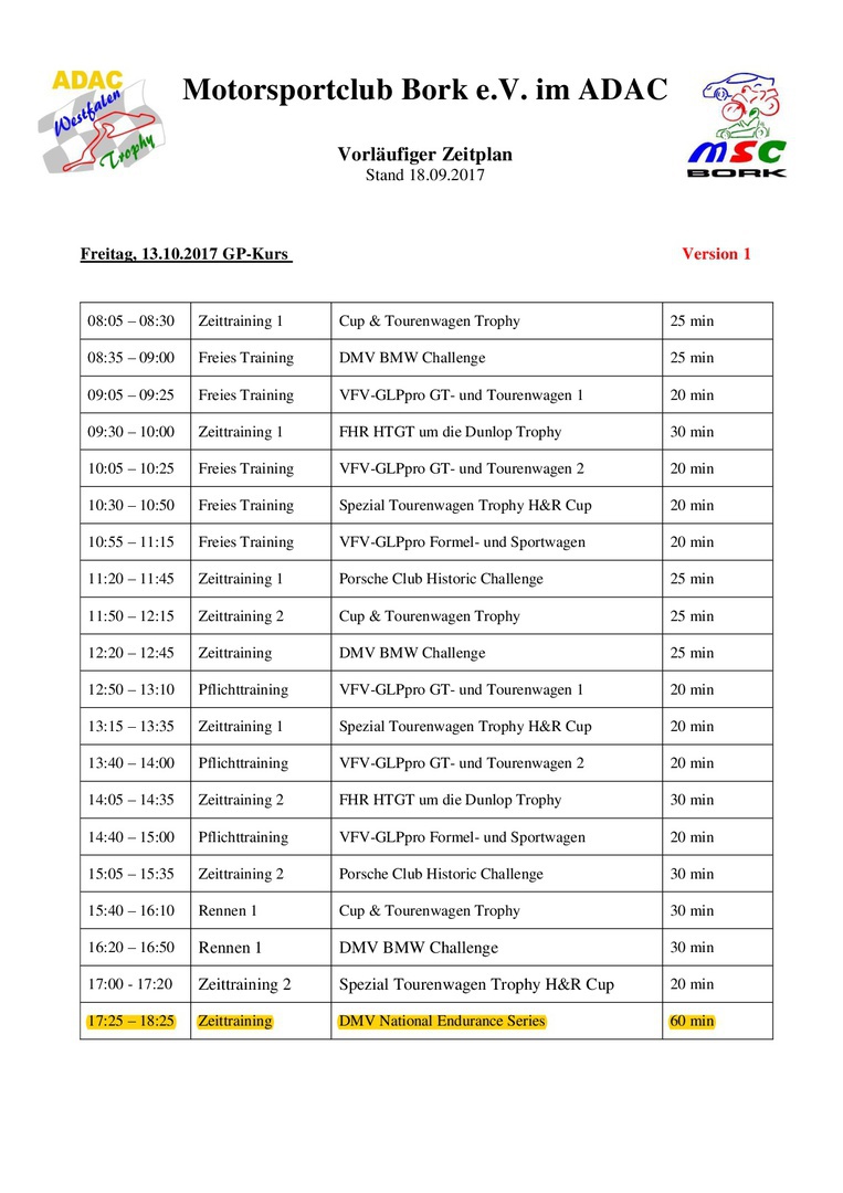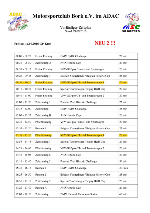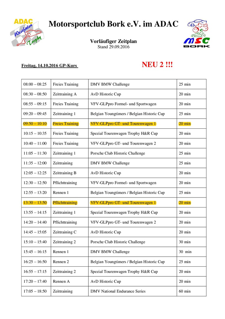 Zeitplan ADAC Westfalen Trophy - NES500: